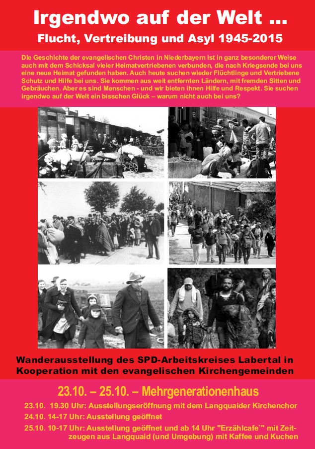 Doch die Ausstellung geht noch weiter, sie spannt den Bogen zur heutigen, ganz aktuellen Situation der Flüchtlinge und Asylbewerber, die heute bei uns Schutz und Hilfe suchen. Jetzt hat der SPD-Ortsverein die Ausstellung auch nach Langquaid geholt. Am Freitag, 23. Oktober, um 19.30 Uhr ist die Eröffnung. "Wir freuen uns, dass MdL Ruth Müller ihren Besuch angekündigt hat und einige Sänger des Langquaider Kirchenchors den Abend musikalisch umrahmen werden", kündigt die SPD-Ortsvorsitzende Kirsten Reiter das Programm für den Abend an. Anschließend bleibt die Ausstellung das ganze Wochenende in den Räumen des Mehrgenerationenhauses in der hinteren Marktstraße.