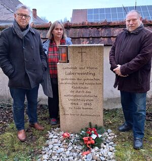 Da die nächste offizielle Gedenkveranstaltung erst für den 1. April 2027 geplant ist, legten Heinrich Mayer, Barbara Kasberger und Rainer Pasta in einer spontanen Aktion Blumen am Gedenkstein im Friedhof Laberweinting nieder.