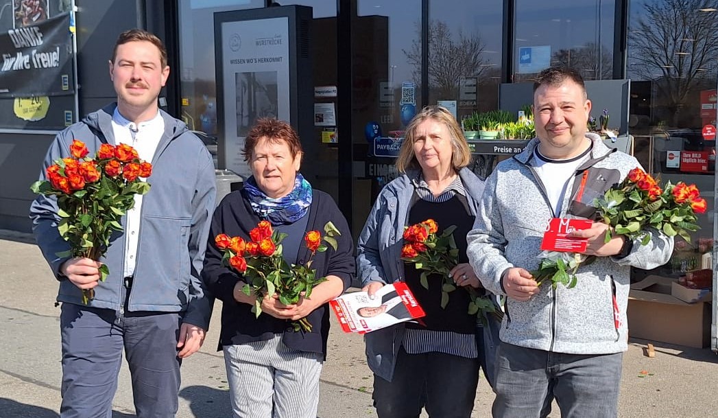 Seit weit über 15 Jahre begeht die Geiselhöringer SPD den Internationalen Frauentag mit einer Rosen-Verteilaktion. So auch in diesem Wahl-Jahr wieder. Traditionell wurden heuer 400 Rosen an Geiselhöringer Bürgerinnen sowie den Beschäftigten im Seniorenheim und im Fachmarktzentrum verteilt. Die Kandidatenriege der SPD erinnerte dabei an den Kampf für mehr Rechte und gegen Diskriminierung, Benachteiligung und Unterdrückung von Frauen, auch in Deutschland.